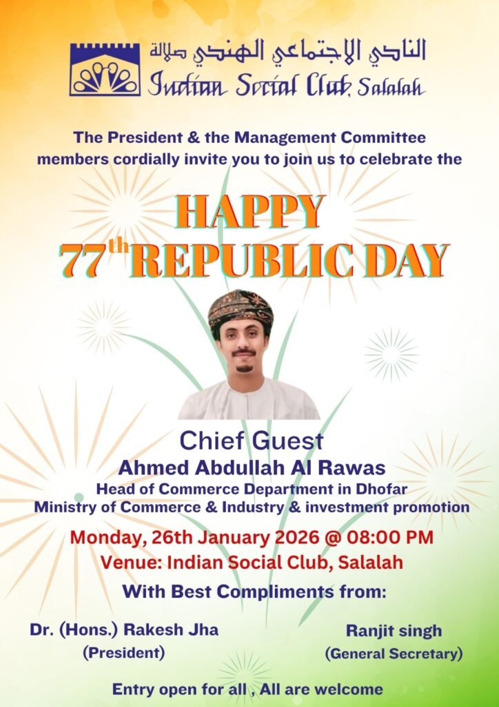 Any Indian national with a valid working visa in Salalah, Oman can apply for membership at the Indian Social Club Salalah.